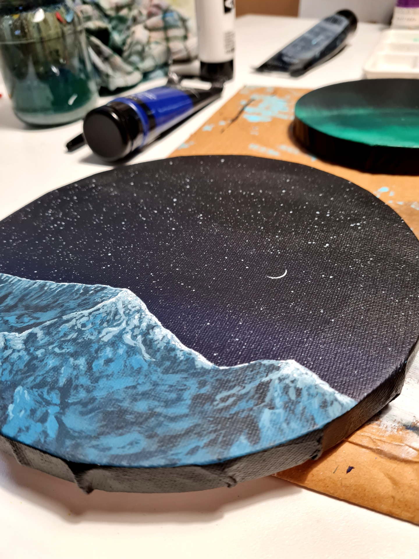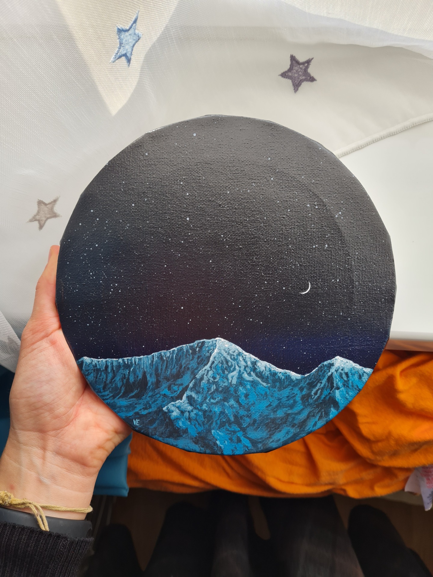 Csendes éjszakai tájkép egy csipetnyi csillaggal, és egy vékony szeletnyi holddal. Bármilyen keskeny kis sarló, nem lehet nem észrevenni, és megcsodálni a szépségét.
