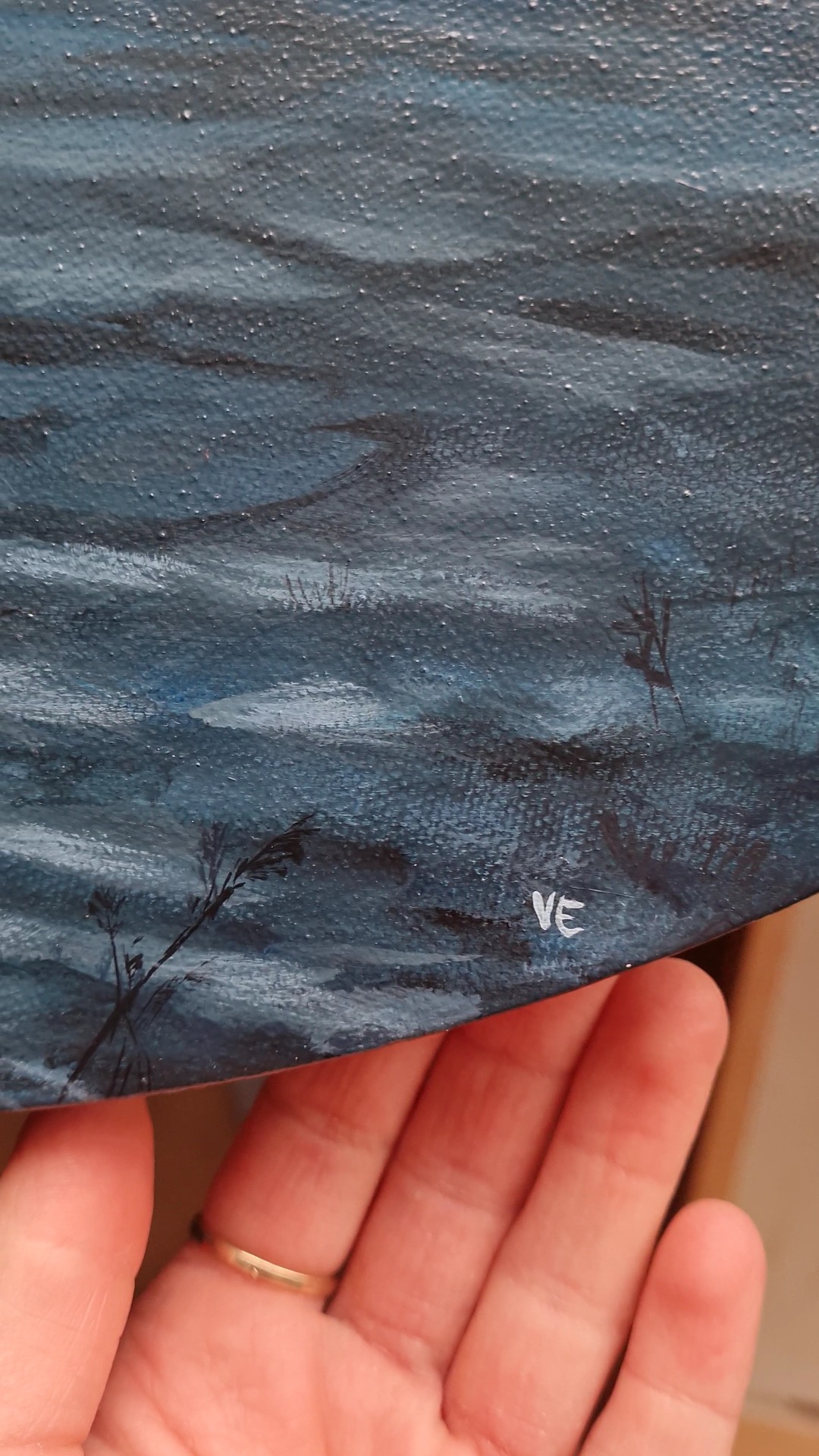 Akril festmény keretre feszített vászonon. Felületét lakkréteg védi.